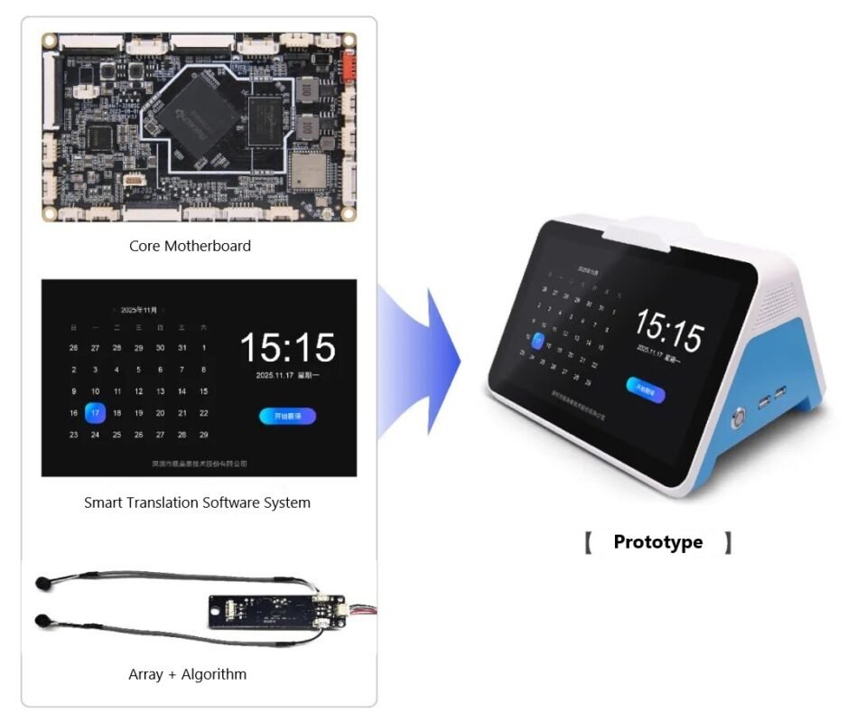 The AI Instant Translator solution launched by Shimeta is a highly integrated and technologically advanced comprehensive system. This solution is meticulously constructed around four core components: the AIoT-3568SC mainboard with powerful processing capabilities, a fully-featured intelligent translation software system, a MIC array for precise sound pickup, and AI noise reduction algorithms that effectively filter ambient noise. Working in synergy, these elements deliver an exceptional real-time translation experience for users.