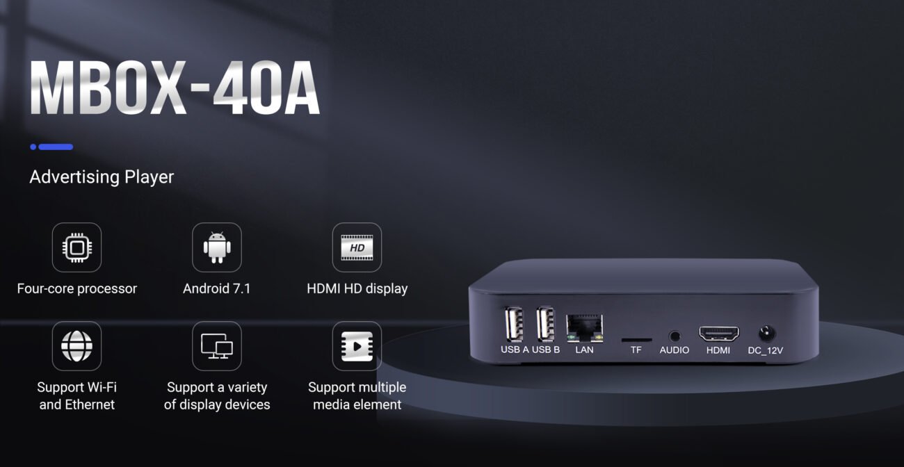 MBOX-40A is a smart Android signage box with A40i quad-core CPU, HDMI 1080P output, split-screen playback, remote scheduling, and WiFi/100M Ethernet.