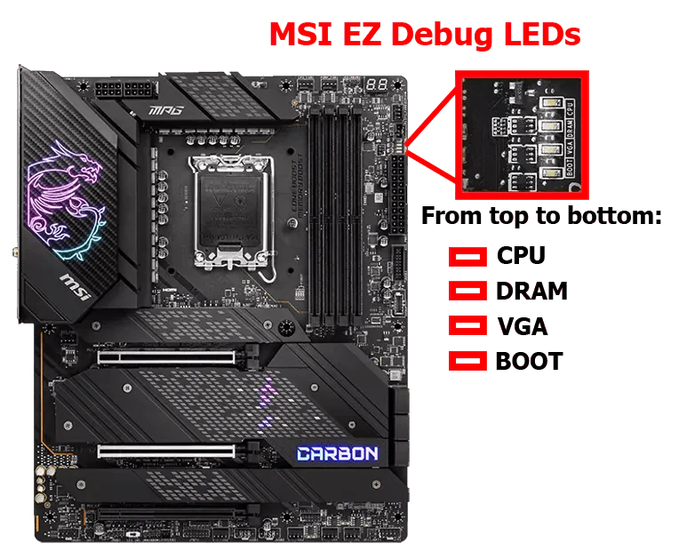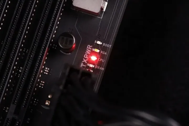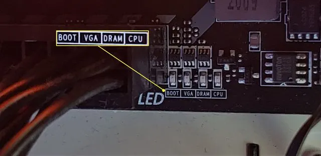 Locate the debug lights. They are typically positioned close to the CPU socket or the motherboard’s edge (see example depicted).