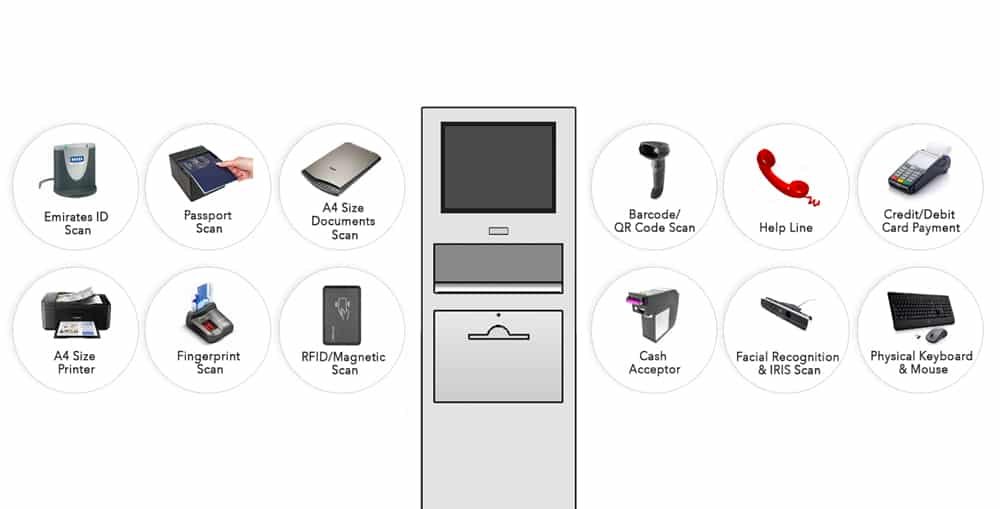 KIOSK hardware includes a CPU for job management, a touchscreen for user input and interaction, and peripherals including payment systems, printers, and scanners for transactions and data entry. A sturdy casing covers the kiosk’s internal components, while communication technology lets it talk to other systems.