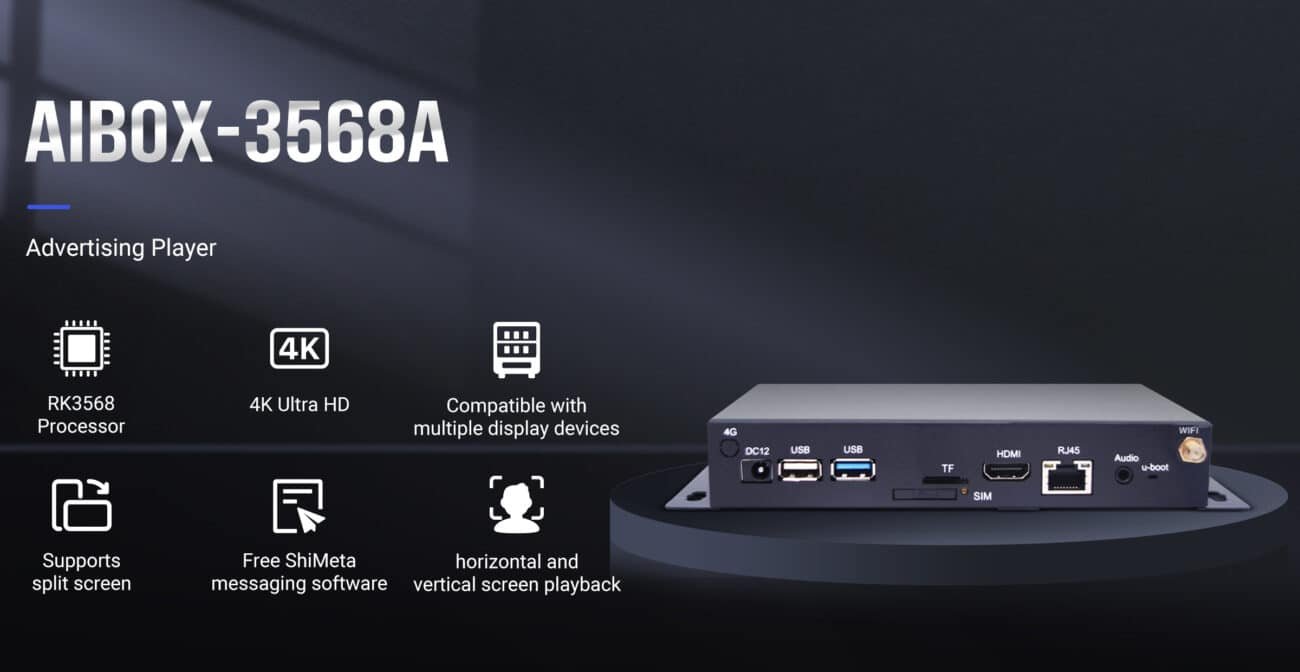 The ShiMeta AIBOX-3568A is an Android digital signage box designed for commercial environments. Powered by an Android operating system, the device supports smooth high-resolution content playback and stable long-term operation.